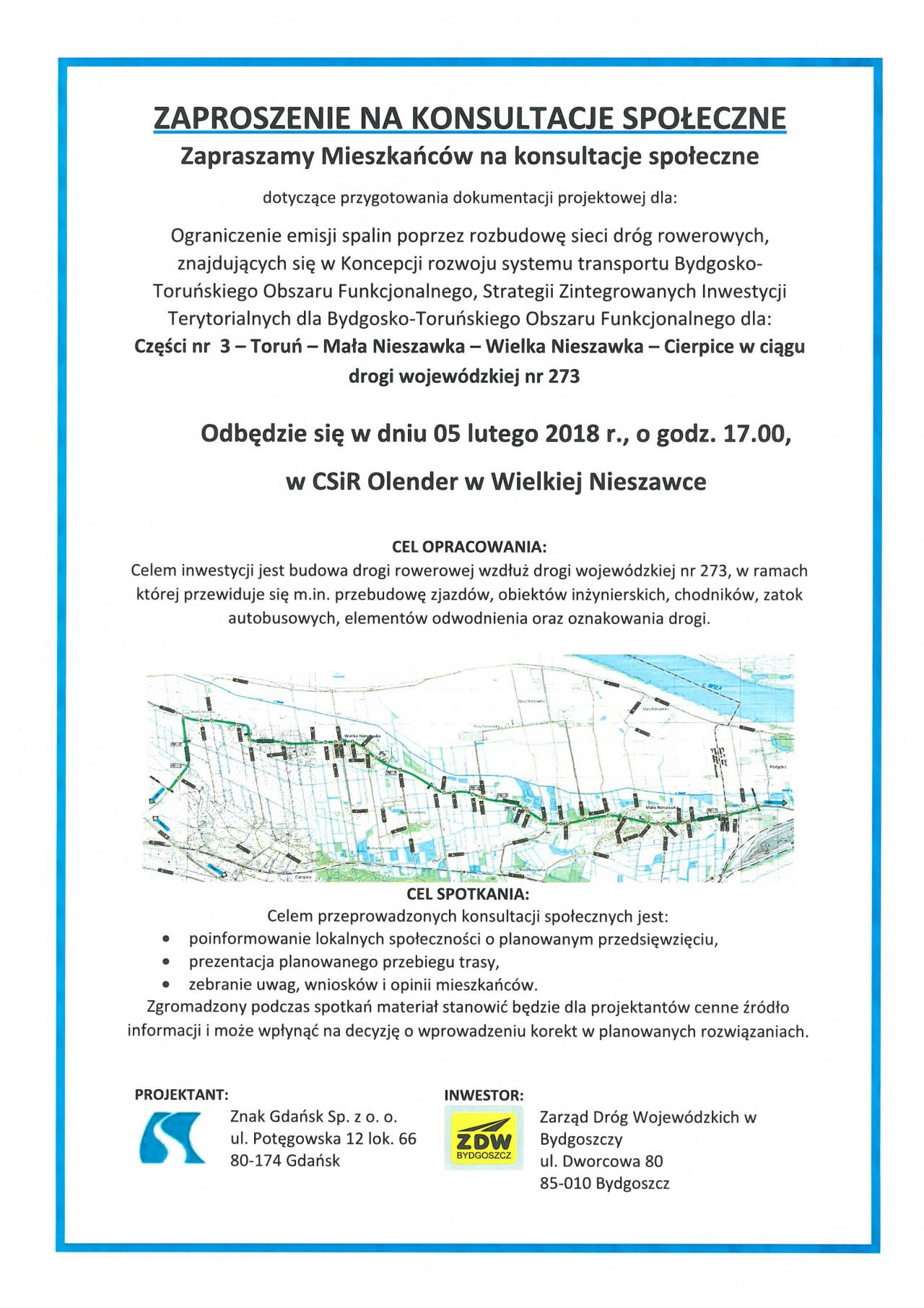 W dn. 5 lutego 2018 r. o godz. 17:00 w Centrum Sportu i Rekreacji Olender w Wielkiej Nieszawce odbędzie spotkanie dla mieszkańców dotyczące budowy ścieżki rowerowej na terenie Gminy Wielka Nieszawka