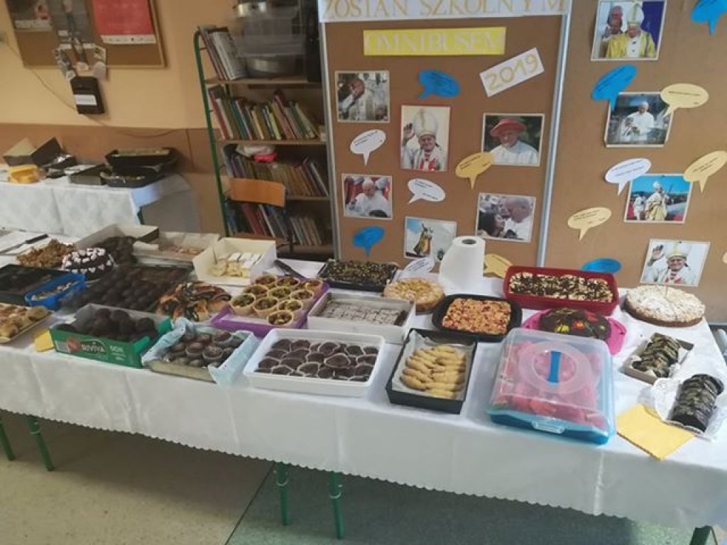 Po akademii zarówno organizatorzy, jak i wszyscy zaproszeni goście mieli okazję spróbować domowych wypieków, popcornu i swojskich przysmaków, przygotowanych przez rodziców uczniów, a także smakowitych kremówek papieskich.